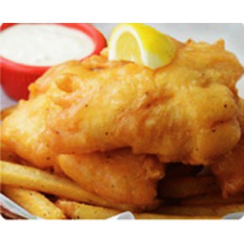 Hand-battered fish fillet served with homestyle fries, sweet corn on the cob and tartare sauce for dipping.