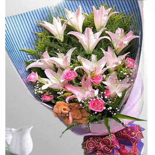 Fresh Mixed Cut Flowers Contains Pink Lilies, Pink Roses Baby's Breath and Greenery with 1 Mini Brown Teddy Bear in a Bouquet.