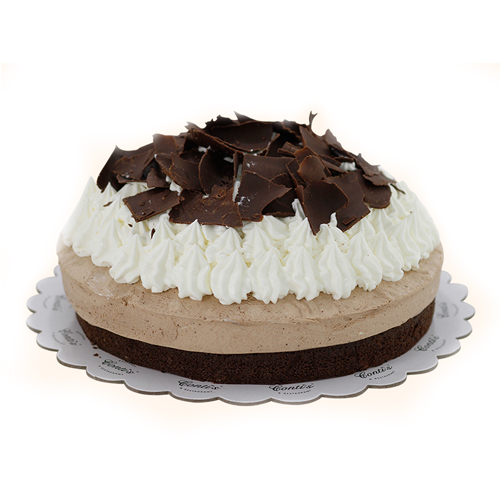 Chocolate cake base with chocolate mousse topped with cream and chocolate shavings