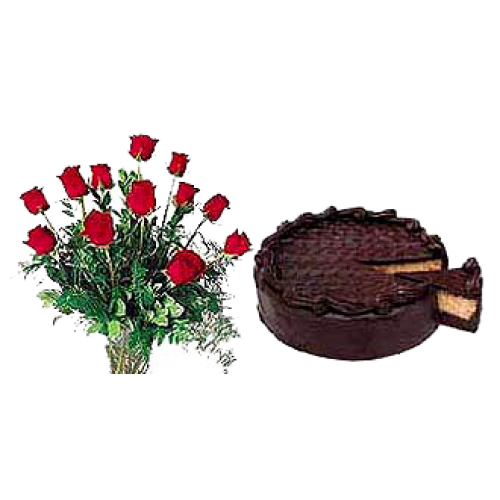 1 dozen red roses in a vase with home made chocolate cake. Cakes by Amor.