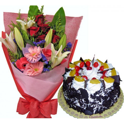 Send a lovely mixture of pink lilies, gerberas and red roses hand bouquet with a gesture of appreciation with Petite (6" Diameter) Black Forest Cake by Goldilocks to say “Thank you” to someone special.